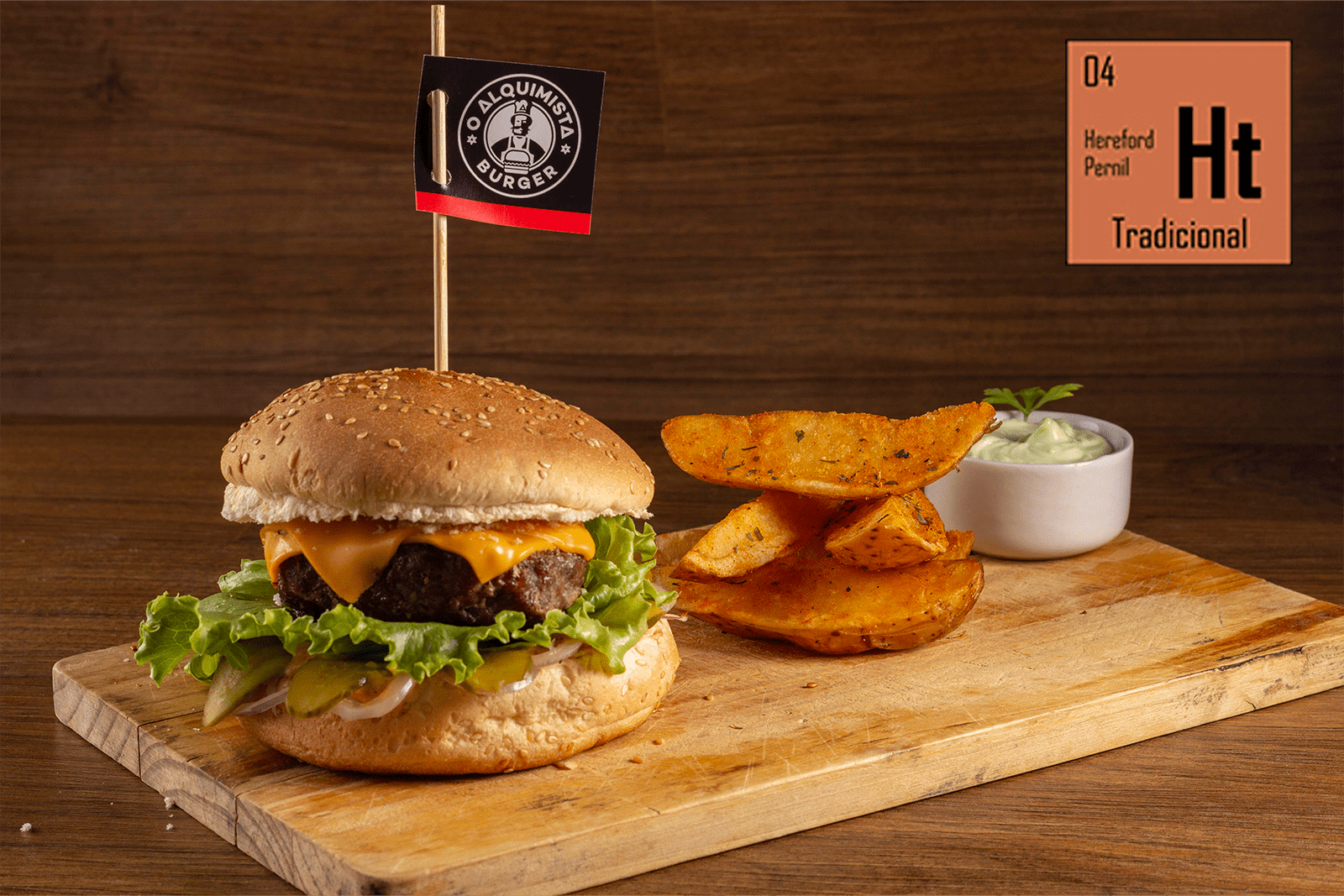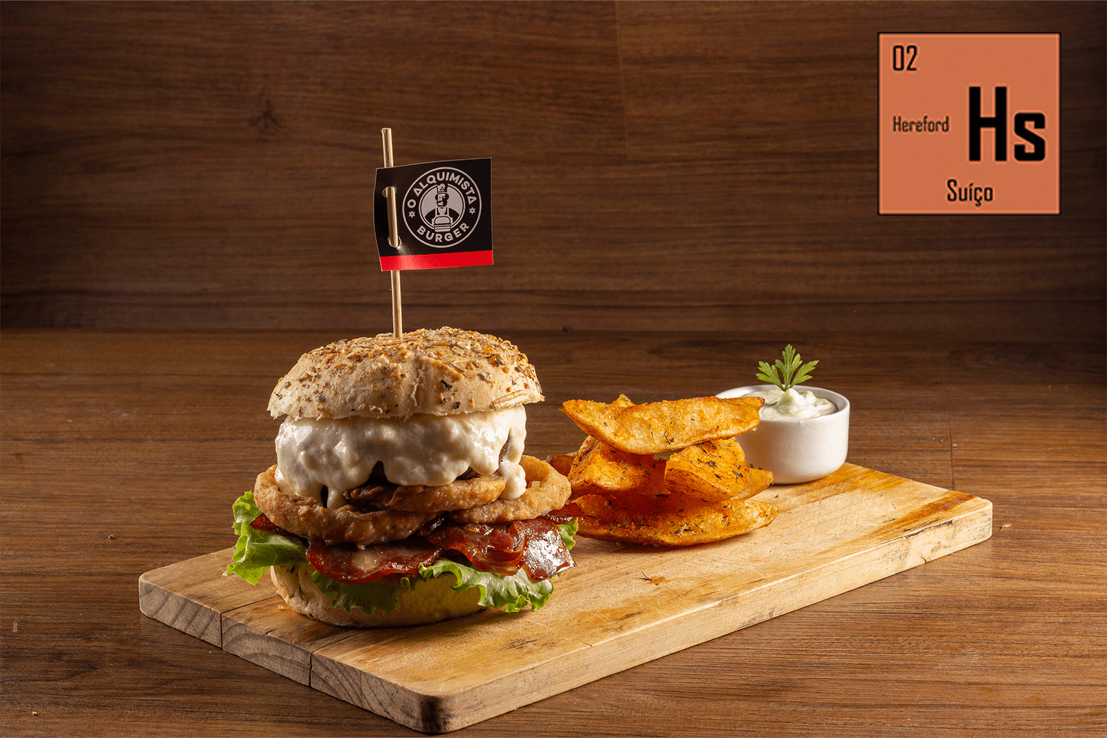 (Carne Hereford) Pão rosenta, hambúrguer com 180g de carne bovina com ervas de provence, molho de queijo gruyère, bacon caramelizado, alface americana e cebola crispy. Acompanha molho de maionese artesanal com ervas de provence.