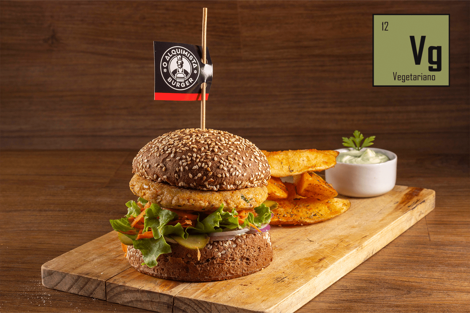 (Pão Australiano, hambúrguer de grão de bico, maionese artesanal, cebola roxa, alface americana, pepinos, tomate, cenoura. Acompanha molho de maionese artesanal com ervas frescas.