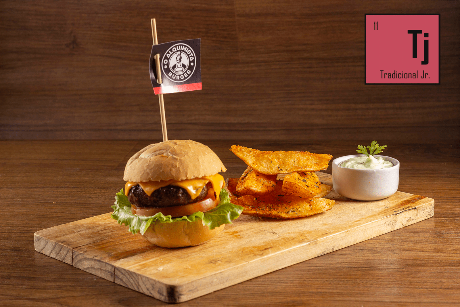 (Carne bovina) - Pão francês junior, hambúrguer com 110g de carne bovina, queijo cheddar, maionese artesanal, tomate e alface. Acompanha molho de maionese artesanal com ervas frescas.