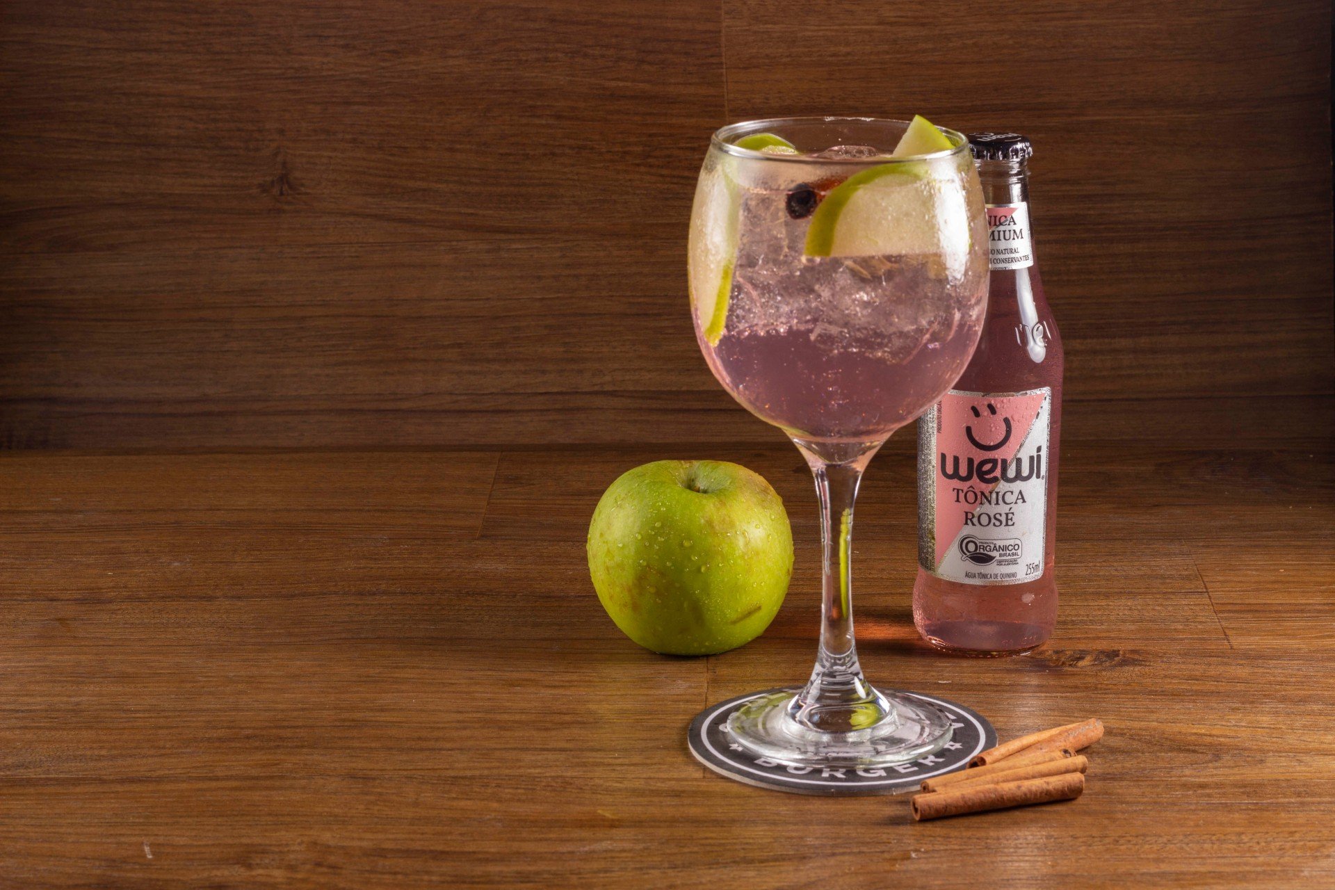 Gin Kalvelage, maçã verde, canela em pau defumada, casca de laranja e tônica orgânica Wewi.